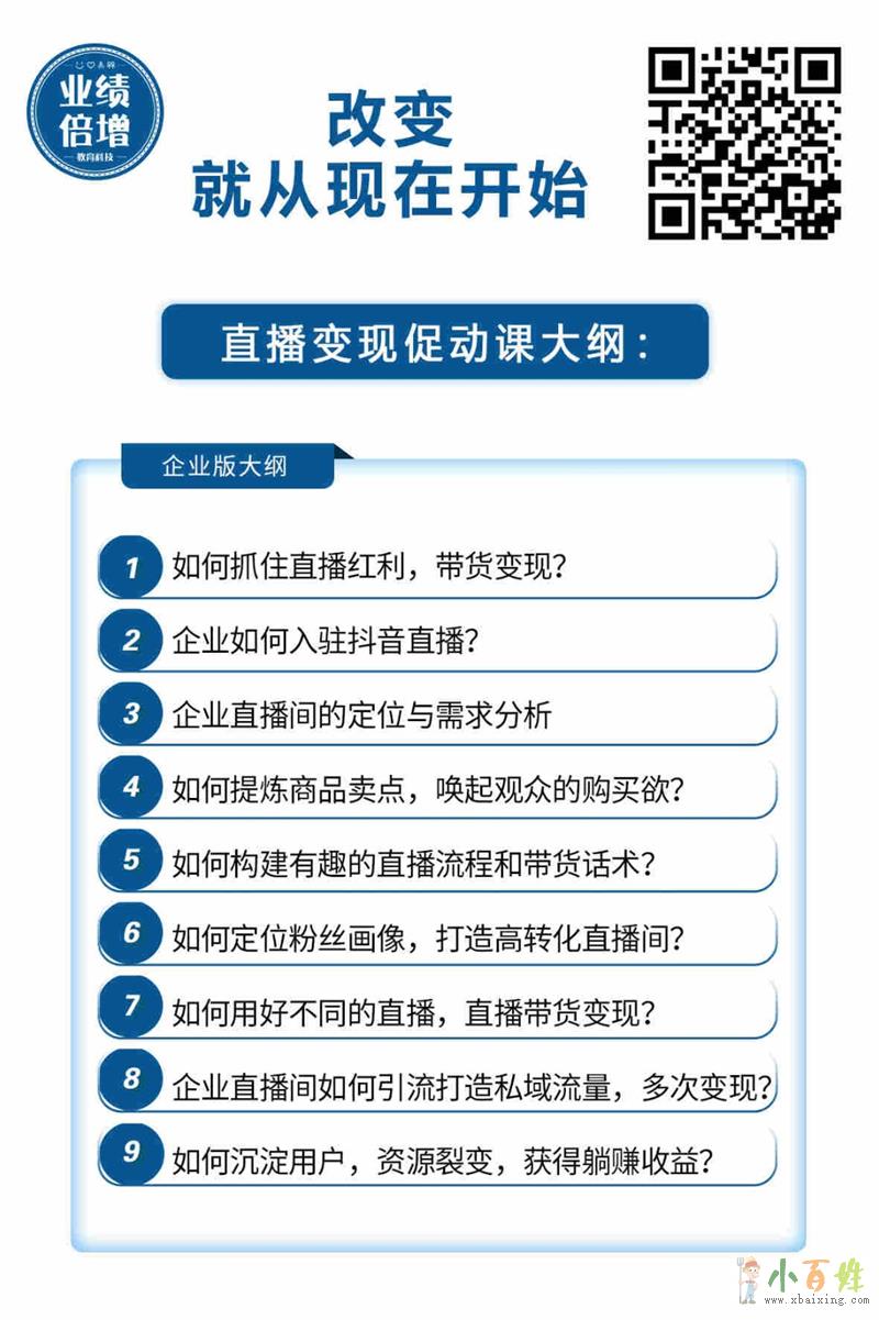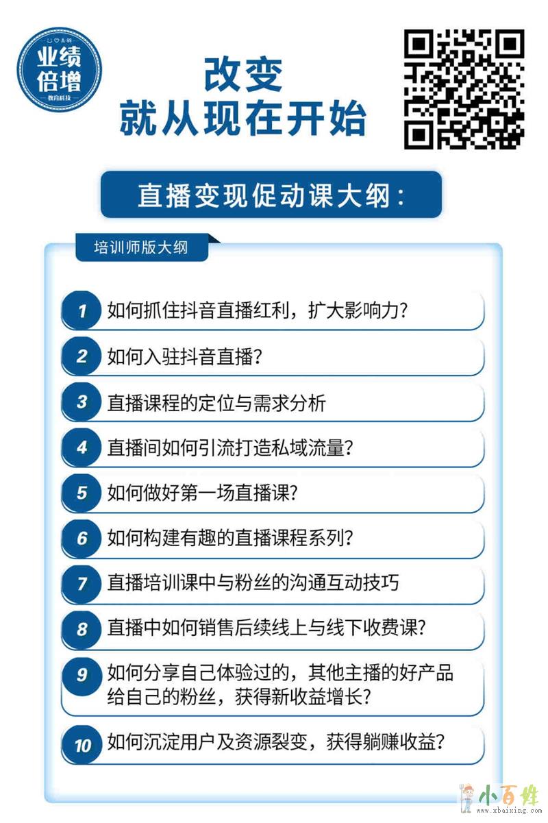 根据学员的不同需求,结合不同行业的形势与特点,业绩倍增教育科技将直播变现促动课的课程设置分为培训师版、企业版。其中培训师版主要围绕做好第一场直播;成功引流打造私域流量;构建有趣的直播课程;直播过程中与粉丝的沟通互动技巧,以及成功销售后续的收费课;从主播到“带货官”的蜕变;沉淀用户及资源裂变实现多渠道创收等全方位的培训。而企业版的则主要围绕提炼商品卖点,快速唤醒观众的购买欲;构建流畅有趣的直播流量和带货话术;定位粉丝话画像以实现直播间高转化;通过不同的直播多方式带货变现;企业直播间打造私域流量的引流方式,助力企业实现多次变现等等来源www.xbaixing.com。