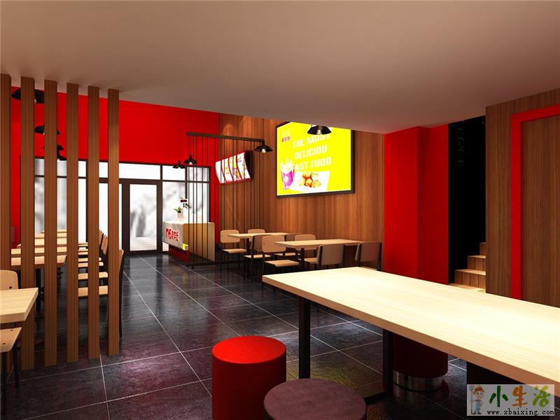 一般我们快餐店的定位是,翻台率高,人流量比较大。所以快餐厅的配色我们一般可以采用明度、饱和度较高的暖色如黄、红等色彩。快餐店的灯光我们也要采用亮度较高的,偏中性色调的灯光www.xbaixing.com小生活网。整体要带给顾客的感觉就是明快利落。这样的装饰氛围也能让顾客的整体就餐速度变快。