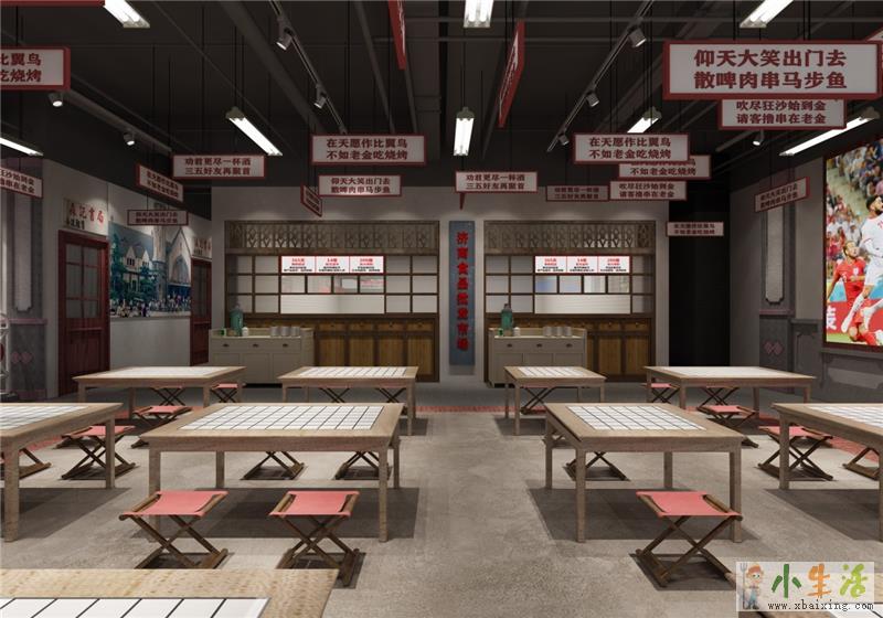 烧烤店的装修风格就要根据烧烤的特点来进行设计了,比如很火的以水浒为主题的烧烤烤肉店,主题烧烤店来源www.xbaixing.com。或者是现在流行的版画文字风格。烧烤店的风格具体还是根据你自己的想法来进行确定,结合设计师给你的建议小生活网www.xbaixing.com。