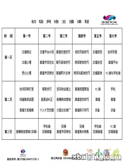 课程内容:房间色彩服饰搭配技巧,PC端与手机端直播实操,主播概论,受众心理学,节目策划与定位,唱歌技巧,个人才艺挖掘,如何增粉,推广,忠实粉丝建立,微信以及微博等自我包装与推广等。