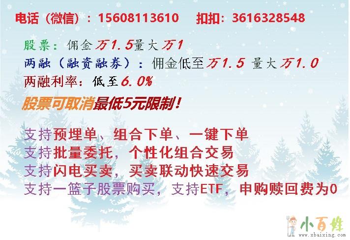 1.A股佣金万1.2,量大万1,可以取消五元限制!2.基金万0.6,量大万0.5,可以取消五元限制!3.融资融券佣金万1.2,量大万1,融资利率5.99!还可以两融绕标!4.债券万0.5,国债逆回购三折!5.期权2元一张,量大1.7元!6.港股通万1.5,同时可以开通纯港股!7.支持量化交易!8.科创板开通 任何投资的问题都可以加我,欢迎咨询!...